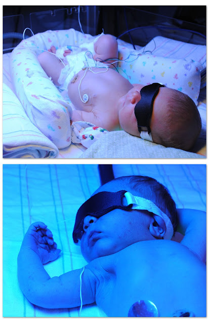 We stayed in the hospital until Monday afternoon and they ran some tests and saw that Noah was at high risk for jaundice but his levels were ok to be sent home. The next day we got some more labs done and it showed he had jumped from a 10 (on Monday) to an 18 (on Tuesday). We were told to head to the ER at Children's Hospital right away to get treatment. Josh and I were really scared. I knew it would be ok but still a scary situation to be in. It was really hard to see them poke and prod our little man. I had to leave when they put in a catheter. I don't think Josh and I have cried that much in our lives! Noah was such a strong little man but he was so frail. At one point his body just went limp from exhaustion. The hardest thing I had to see!